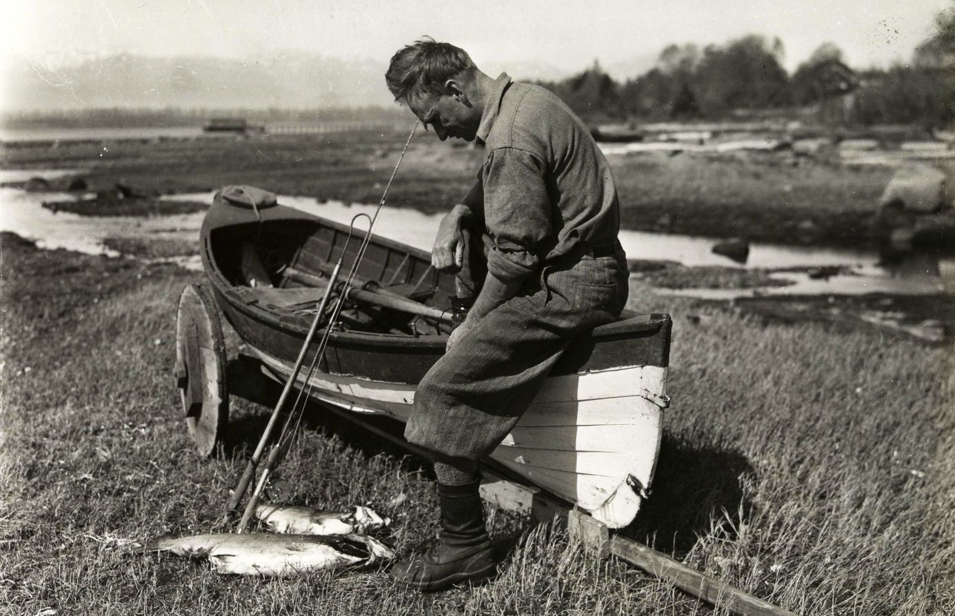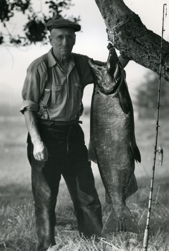 - Laing with a 52 pound tyee salmon caught at Comox, 1955